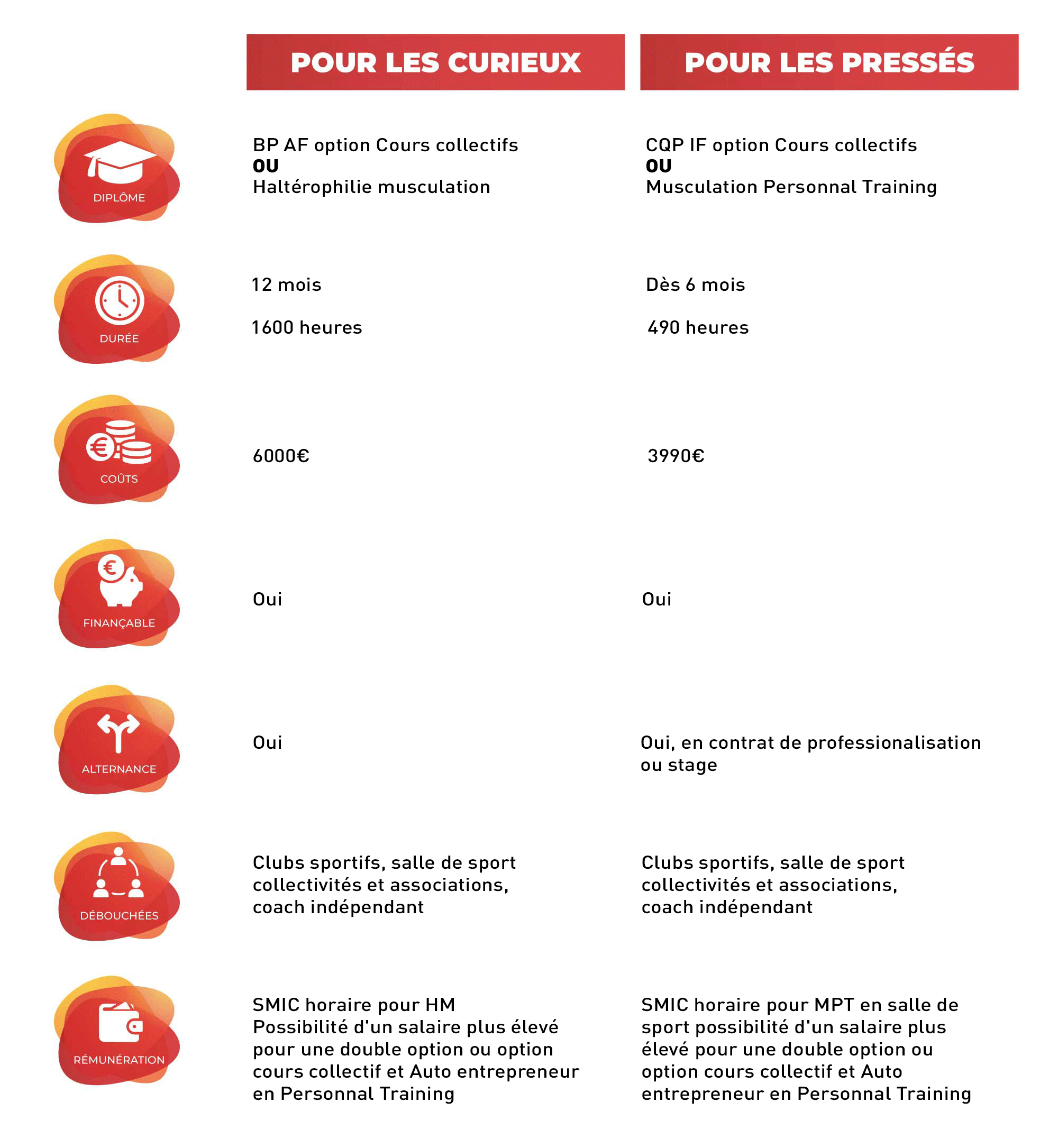 Concernant le CQP, il est recommandé pour un public averti. En effet, cette formation plus courte, s’adresse à un public sportif, des sportifs professionnels, des sportifs aguerris en reconversion. Avec une solide connaissance du sport, les compétences apportées viendront valider vos acquis et vous permettront de devenir coach sportif.
